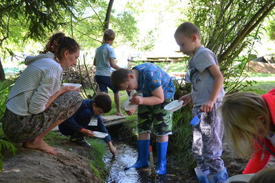 Ubytování ve stanech, zázemí unikátní rekonstruované historické usedlosti, malá farma a možnost zapojení do péče o králíky, slepičky, ovečky a kozy. Nádherná podještědská příroda! Návštěva včelí a koňské farmy. Letní kino i pravá dětská párty ve stodole. Týdenní turnusy (ne-so) běží po celé letní prázdniny.